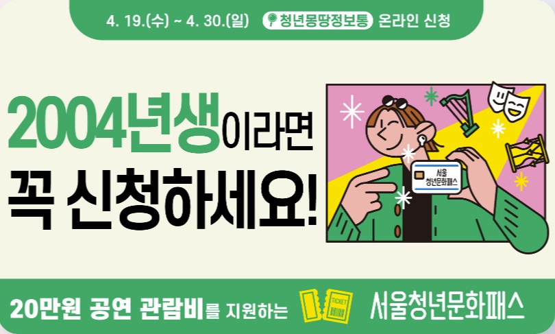 서울청년문화패스란 서울시에 거주하는 2004년생 청년을 대상으로 하는 문화 바우처지원 사업입니다. 사회에 첫 발을 내딛는 청년들에게 문화예술을 즐길 수 있는 기회를 마련해 주는 사업입니다. 청년들에게는 연극, 뮤지컬, 무용, 클래식, 전통예술 등 관심 있는 분야를 선택해서 관람할 수 있도록 지원해주고, 또한 문화예술분야 활성화도 지원하는 1석2조의 효과를 기대하는 사업입니다. 신청자격과 조건, 그리고 신청방법에 대해 상세히 안내해 드립니다.
